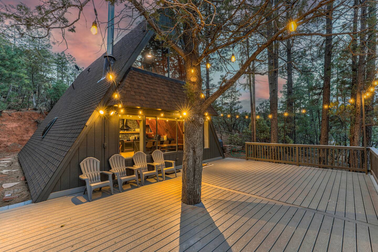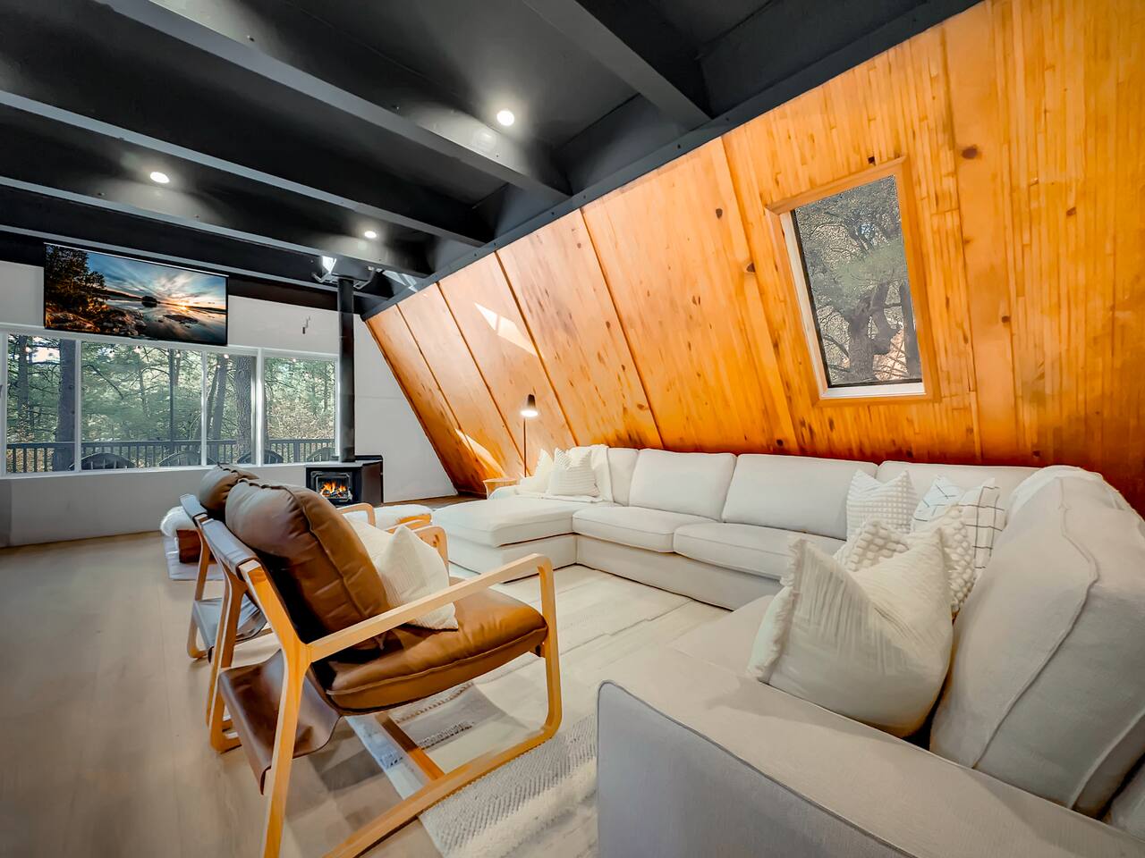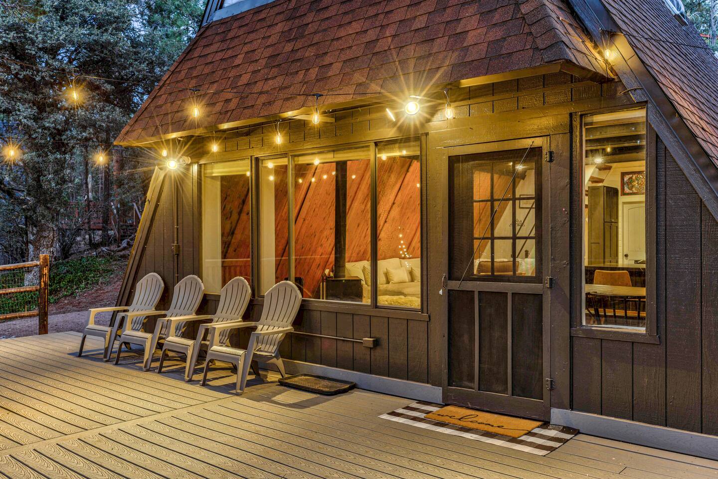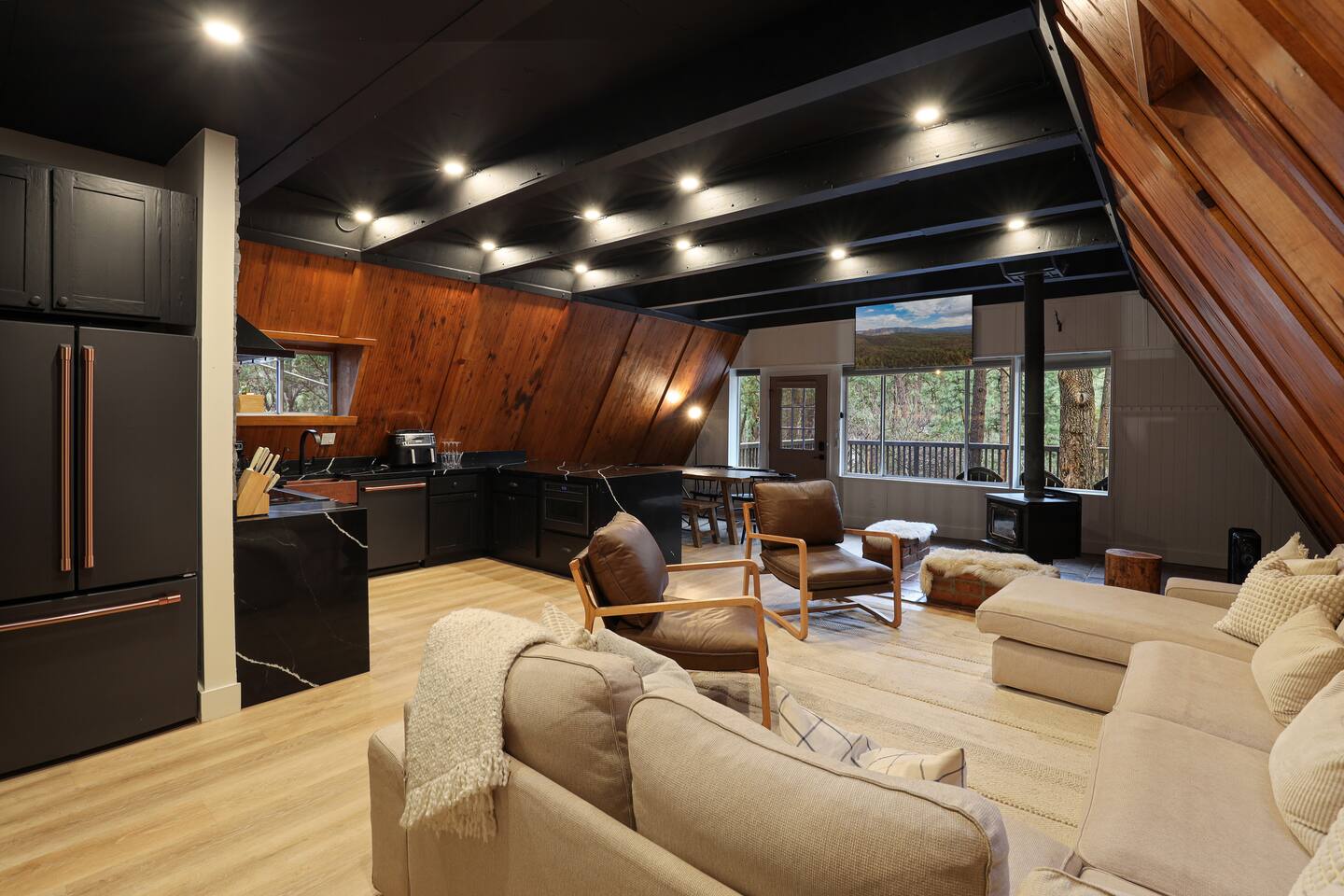 Completely surrounded by pine trees, this magical A-Frame cabin has been completely remodeled with a modern luxury spin. Escape the busy and find relaxation here. Enjoy the massive front deck that looks out into the numerous tall pines surrounding the property. Cozy up inside while enjoying the fully stocked luxury kitchen. Rest easy in comfortable King & Queen sized bedrooms. Adventure upstairs to a large loft with fun bunk beds. Unforgettable memories are made here in this unique place. Enjoy!