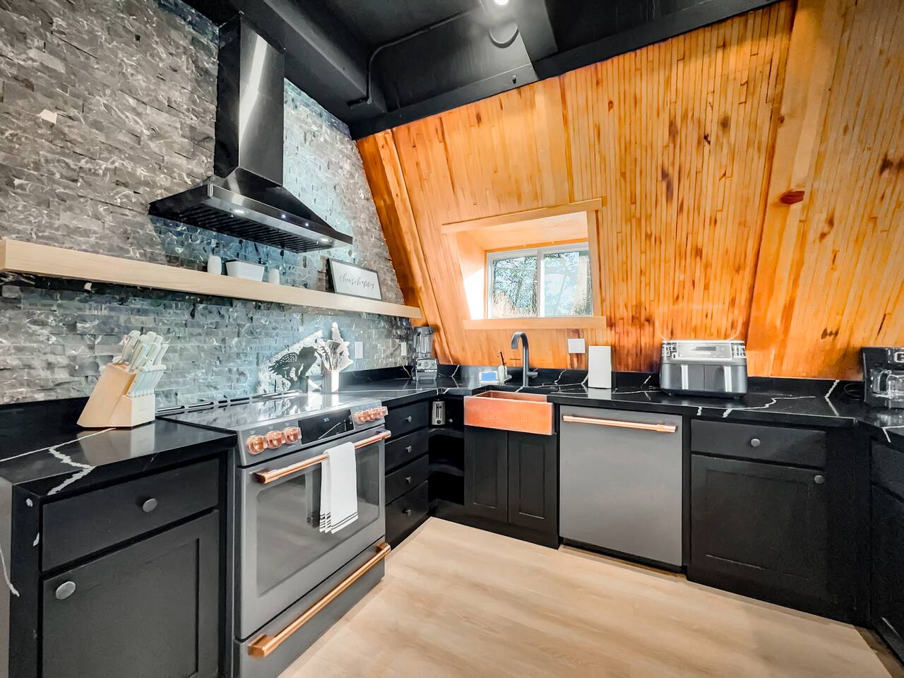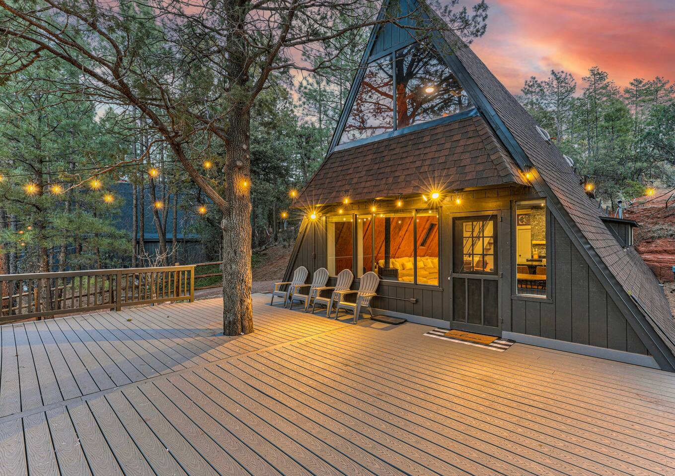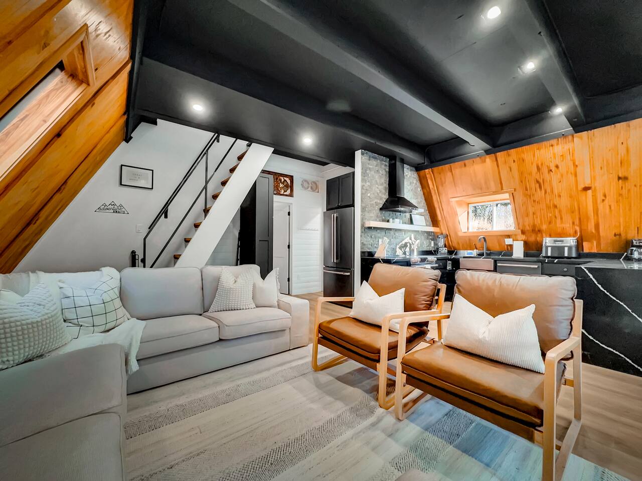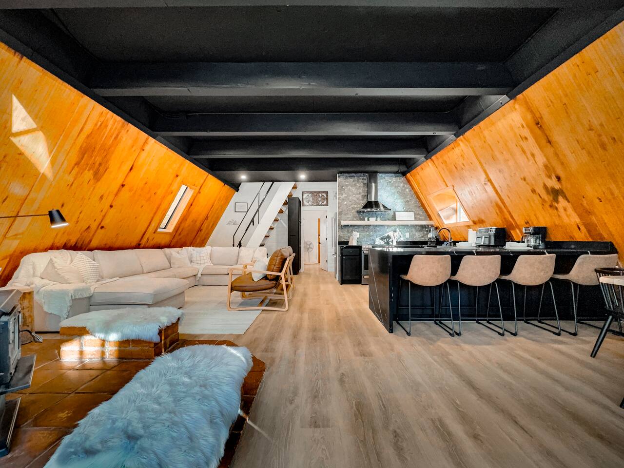 Completely surrounded by pine trees, this magical A-Frame cabin has been completely remodeled with a modern luxury spin. Escape the busy and find relaxation here. Enjoy the massive front deck that looks out into the numerous tall pines surrounding the property. Cozy up inside while enjoying the fully stocked luxury kitchen. Rest easy in comfortable King & Queen sized bedrooms. Adventure upstairs to a large loft with fun bunk beds. Unforgettable memories are made here in this unique place. Enjoy!